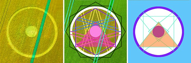 Ein etwa 25 m durchmessender Ring ist nahe Devizes so angelegt, dass eine Traktorspur wie eine Tangente an dessen ca 7 m Kreisfläche im Zentrum vorbei geht. Wenn man diese Spur spielerisch spiegelt, erkennt man, dass dies nicht zufällig ist, sondern eine versteckte hexagonale Struktur offenbart, in der sich sogar der Pyramidenwinkel zeigt. Ein rund um den Außenkreis gelegter Zwölfstern berührt exakt die nächste Traktorspur, sodaß man sagen muß, diese Feinheiten können nur sein, weil die Größe von Ring, Zentralkreis und Tramlines perfekt aufeinander abgestimmt sind.