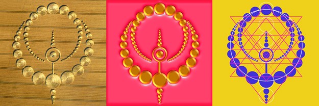 Dieser geniale OM-Kornkreis erschien am 7.7.2007 (dreimal die Sieben) nahe Alton Barnes/GB und zeigt die mathematisch-geometrische Version der Sanskrit-Silbe OM, die den transzendenten Urklang symbolisiert. Auf einer weiteren Bedeutungsebene stehen die Segmente des Zeichens (von unten nach oben) für Unbewusstes, Traumbewusstsein, Tagesbewusstsein, Überbewusstsein und das Herz der Schöpfung. Wenn man die Mittelpunkte dieser Elemente verbindet, ergibt sich Erstaunliches: Die Linie vom Zentrum des Unbewussten hin zur Schöpfungsmitte hat einen Winkel von 52 Grad, dem Böschungswinkel der Großen Pyramide! Das will uns sagen, daß der magische Aufstieg des Menschen aus dem Unbewussten letztlich in die vollbewusste Transzendenz, ins Herz der Wirklichkeit führt!